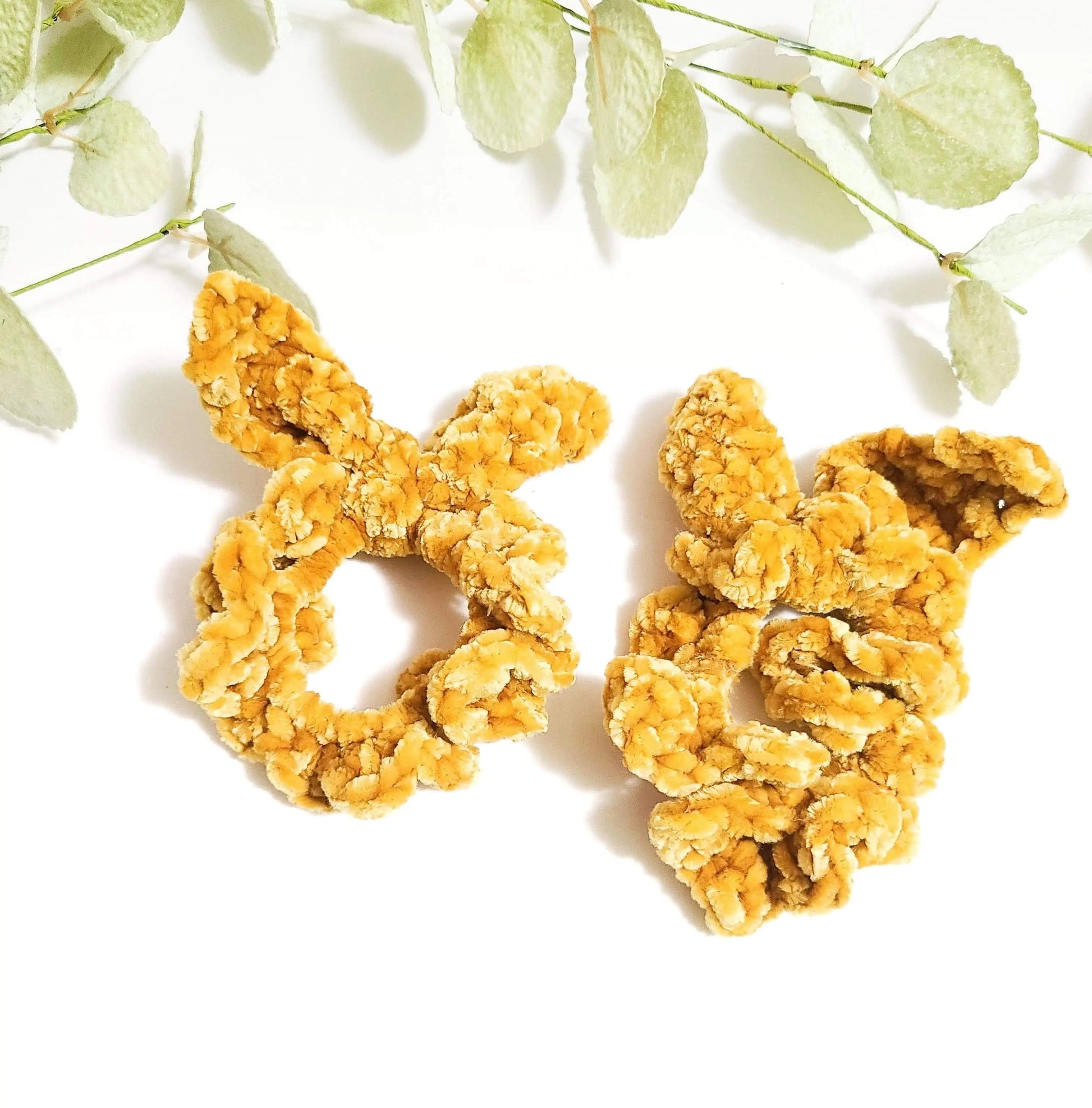 Get that hair up and let your neck feel the breeze with a soft velvet scrunchie! This hair tie is made handmade crochet around a sturdy elastic hair tie. Now that doesn't mean pull it until it pops because it will pop if you try but this hair tie will put up a good fight. It is made from tough, stretchy elastic and reinforced. So don't worry about this hair tie having a loose grip, you can usually tie around twice depending on how thick your hair is! This unique accessory includes two velvet scrunchies of your choice. Lovely color options are available! There is bunny ear effect on these hair ties, but if you don't like it then you are able to remove it by undoing the bunny knot!